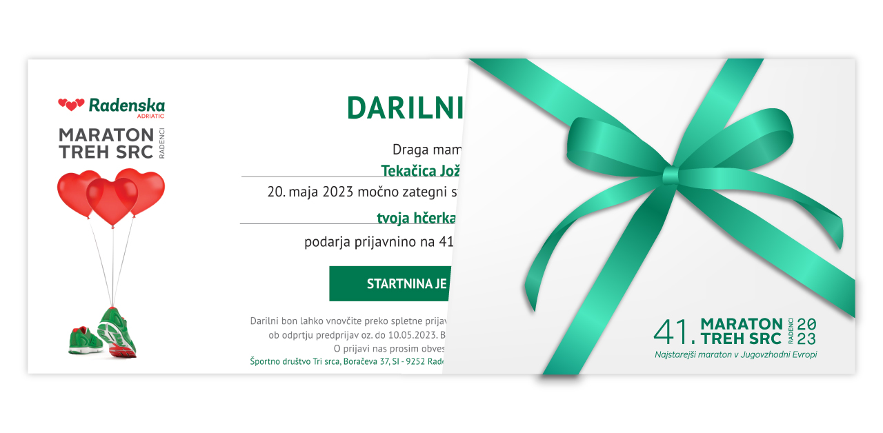 Razveselite prijatelje, ki radi tečejo in jim podarite prijavnino na 41. Maraton treh src, ki se bo odvil 20. maja 2023.