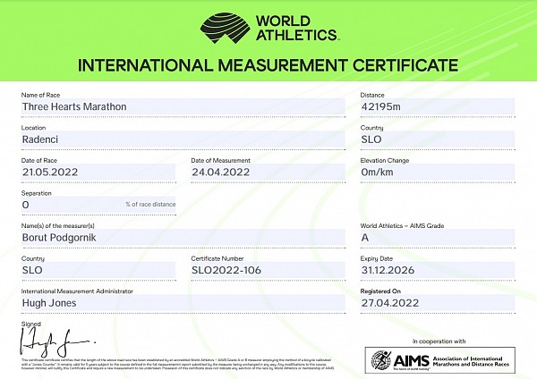 Maratonska in pol maratonska trasa sta sedaj tudi uradno certificirani s strani Mednarodne atletske zveze / World athletics.