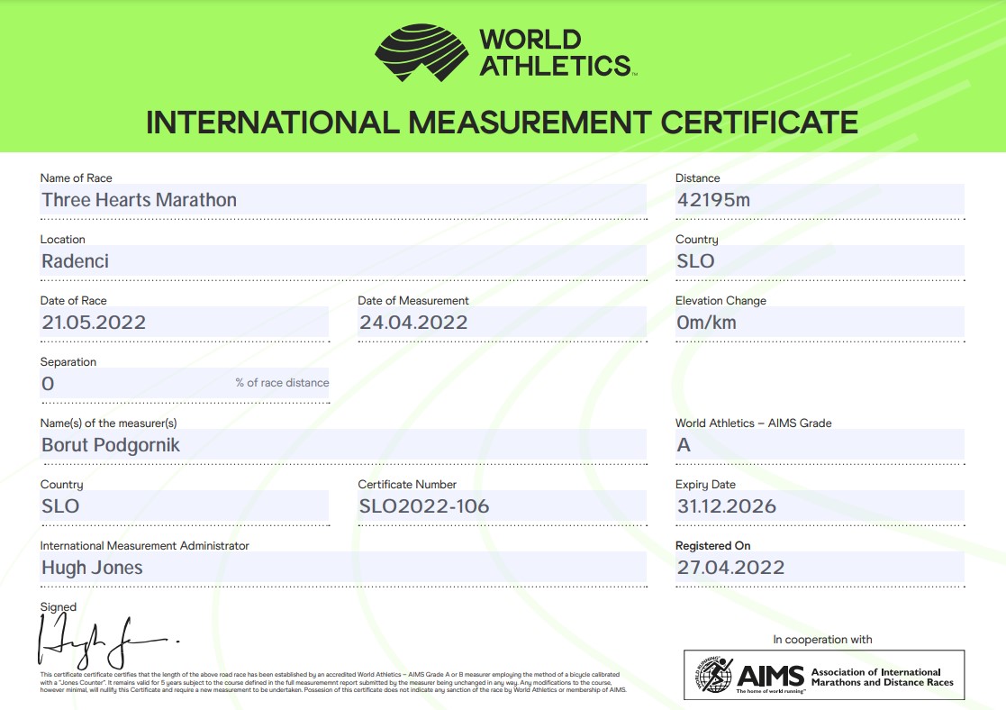 S tem certifikatom zagotavljamo točnost dolžin prog in s tem je na naših progah možno pridobiti kvalifikacijski čas za Svetovna prvenstva, Olimpijske igre in druge velike maratone, ki zahtevajo za svojo udeležbo uradne čase certificiranih prog.