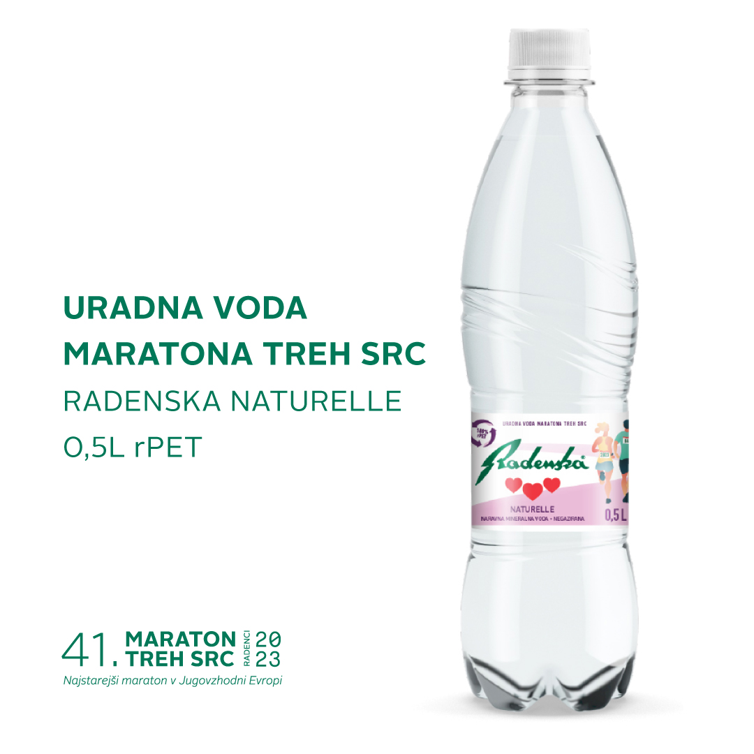 Uradna voda Maratona treh src je že nekaj let Radenska Naturelle 0,5L PET. Letos pa premierno posebna izdaja Radenske Naturelle z etiketo, posvečeno Maratonu treh src. Ponosni do neba in hvala Radenski ... Seveda v plastenki iz 100 % recikliranega PET materiala.