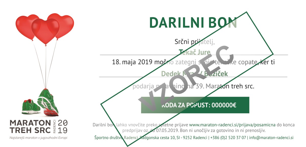 Vse kar morate narediti je, da nam na info@maraton-radenci.si pošljete vaše ime in priimek ter ime in priimek osebe, ki jo želite obdariti in poravnate prijavnino. Prejeli boste darilni bon, s katerim boste presenetili tekaške prijatelje. :)
