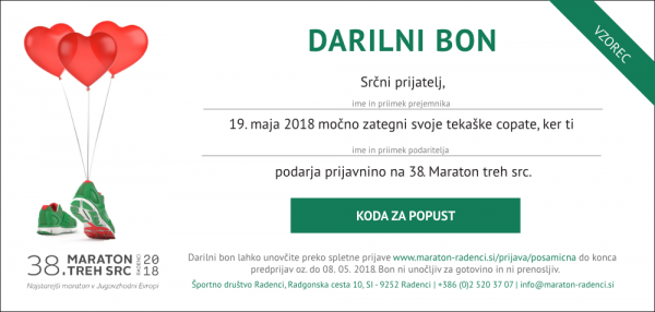Vse kar morate narediti je, da nam na info@maraton-radenci.si pošljete vaše ime in priimek ter ime in priimek osebe, ki jo želite obdariti in poravnate prijavnino. Prejeli boste darilni bon, s katerim nato presenetite vaše tekaške prijatelje.
