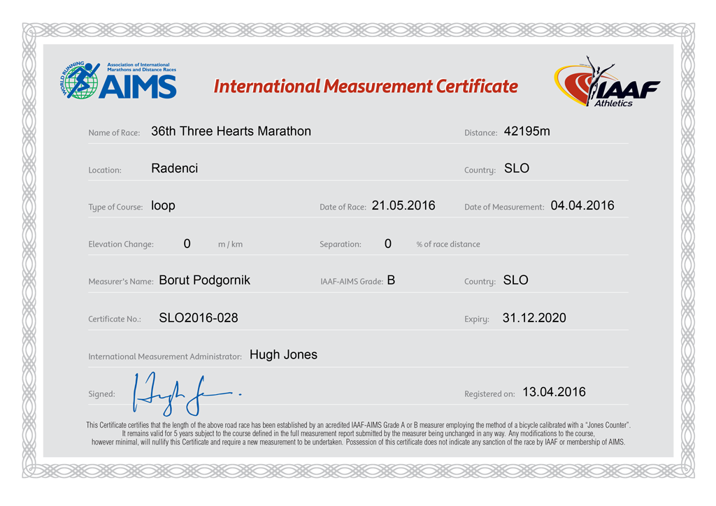 Pred dnevi smo uradno izmerili traso Maraton Radenska Classic (42.195 m) in Polmaraton Radenska Light (21.098 m), za kateri smo prejeli certifikat Mednarodne atletske zveze (IAAF) in Mednarodnega združenja za maratone in dolžinske teke (AIMS).