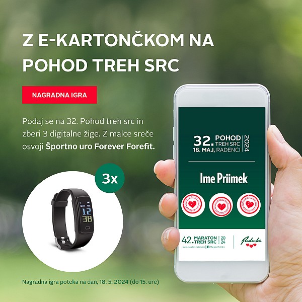 Podaj se na 32. Pohod treh src in na kontrolnih točkah, s skeniranjem QR kode, zberi 3 digitalne žige na svojem e-kartončku ter potrdi sodelovanje v nagradni igri. Z malce sreče osvoji Športno uro Forever Forefit!