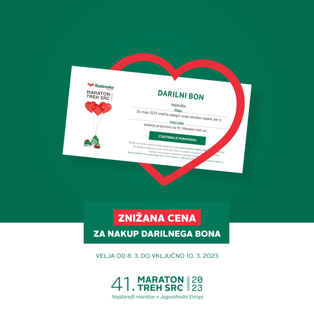 Znižana cena za nakup darilnega bona je veljavna do vključno petka, 10. 3. 2023, za trase 42, 21, 10, 5 km in nordijsko hojo.